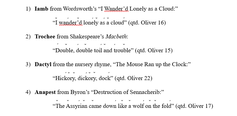 Stress has a unique definition in poetry, denoting that the syllable is emphasized. This emphasis contrasts with unstressed, meaning that the syllable is not emphasized. The combination of stressed and unstressed syllables creates a metrical foot. Oliver elaborates on this basic definition, saying that “each foot is constructed of a single emphasis plus details–that is, [only] one heavy stress [with] whatever light stresses are needed to make up the chosen pattern,” which will be discussed in the next subsection (11). When reading poetry, these metrical feet can be uncovered through scansion, the act of writing the meter of a poem, using a macron (´) to denote a stressed syllable and a breve (˘) to denote an unstressed syllable (Oliver 10). After scanning through a line or two, a pattern may emerge (Oliver 11, 89), which will be discussed in the following subsection.