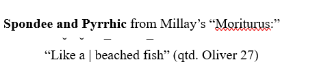 Contrary to the strict metrical pattern in the iambic and anapestic examples above, “substitutions are allowed” (Oliver 13). Oliver further explains the ability to substitute in writing by laying out a general rule: “Any of the four patterns given may at any time be substituted for any other” (Oliver 14). She later adds spondees to this list (Oliver 18).