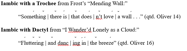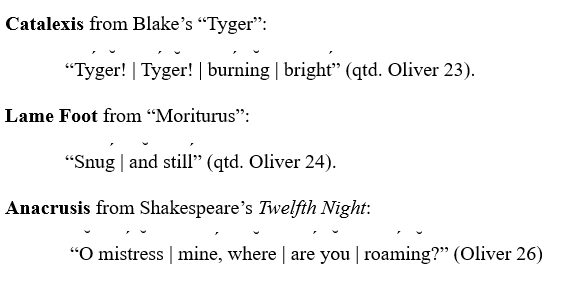In the previous examples, except for number three, the poems did not deviate from the common metrical patterns. However, many poems do so in several ways, such as uncommon metrical feet, “substitution of one meter for another[,] . . . tags[,] . . . [or] impure meter” (Oliver 22). These variations will be explored in the rest of this section.