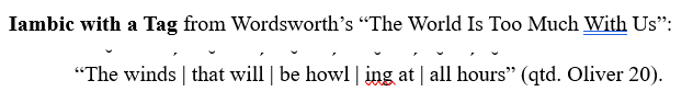A tag changes the end of the line by adding an unstressed syllable after the ending stressed syllable (Oliver 22). In iambic or anapestic meter, this change creates a feminine (unstressed) ending rather than a masculine (stressed) one (Oliver 21-22).